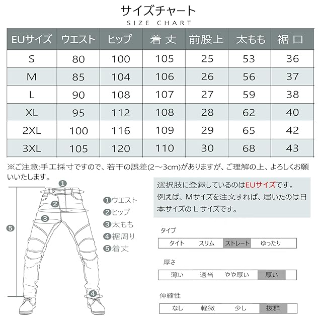 商品詳細:<br> 商品名:ライディングパンツ 冬用 メンズ<br> カラー展開:ブラック/ブルー/ブラックA/ブルーA<br> 素材構成:70%コットン+28%ポリエステル+2%スパンデックス<br> サイズ表記:<br> S: ウエスト80cm ヒップ98cm 着丈108cm 太もも53cm 股上26cm 裾34cm<br> M: ウエスト85cm ヒップ103cm 着丈109cm 太もも56cm 股上27cm 裾37cm<br> L: ウエスト90cm ヒップ108cm 着丈110cm 太もも59cm 股上27.5cm 裾39cm<br> XL: ウエスト95cm ヒップ112cm 着丈111cm 太もも62cm 股上28cm 裾40cm<br> 2XL:ウエスト100cm ヒップ116cm 着丈112cm 太もも65cm 股上28cm 裾40cm<br> 3XL:ウエスト105cm ヒップ120cm 着丈113cm 太もも68cm 股上29cm 裾42cm<br> ご注意:<br> ※サイズは平置きした状態で計測していますので、2-3cmの誤差はご了承ください。<br> ※モニターにより、実物と色や素材の感じが多少異なって見える場合がございます。予めご了承下さい。<br>