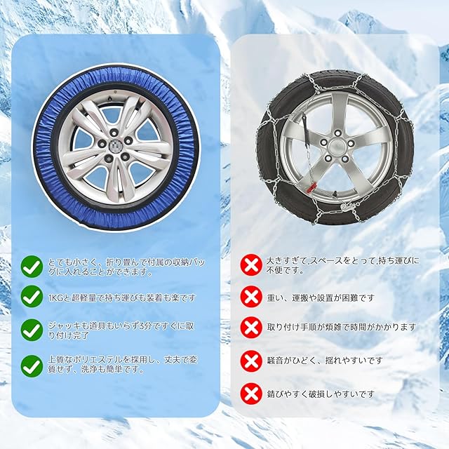 【グリップ力抜群】上質ポリエステルを採用、グリップ力を大幅に強化して、路面凍結、雪道、雨天など様々な天候に対応します。柔らかい繊維生地はタイヤを傷つけません、耐摩耗。