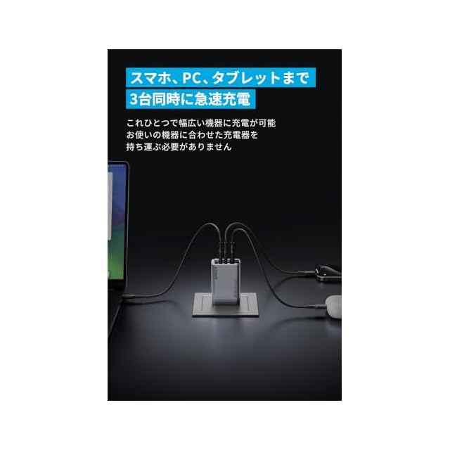 スマホ、PC、タブレットまで3台同時に急速充電:これひとつで幅広い機器に充電が可能。お使いの機器に合わせた充電器を持ち運ぶ必要がありません。