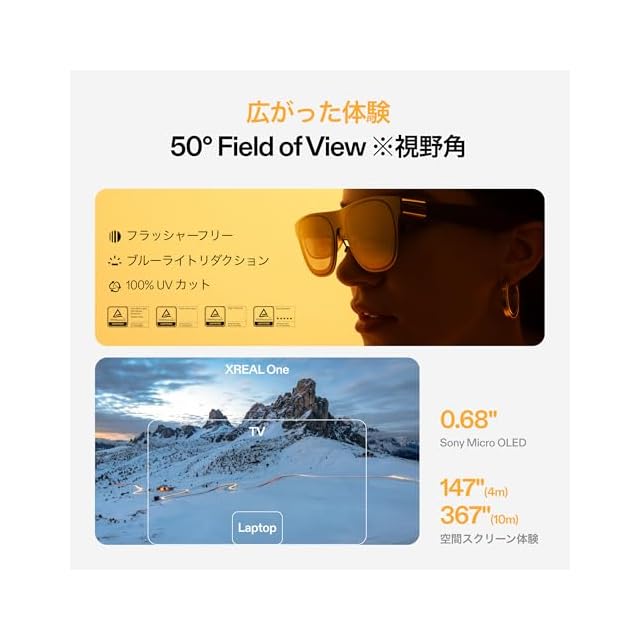 【最大367インチの大画面スクリーンと50°の視野角で広がる視覚体験】XREAL Oneは0.68インチのSony製マイクロOLEDディスプレイと独自の光学エンジンを搭載。最大367インチ(約10メートルの距離からの投影に相当)の巨大な仮想スクリーンと50°の視野角、600ニットの実効輝度を実現し、業界をリードする視覚体験をお楽しみいただけます。