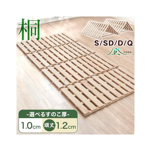 ・国内の第3者機関にて、性能試験を実施<br>・布団を湿気・結露から守るすのこマット<br>・脚数を増やし、耐荷重180kgの頑丈設計を実現!<br>・お子様にも安心の低ホルムアルデヒド仕様<br>・四つ折りにして布団干しも楽に!<br>・折りたたみ固定は簡単マジックテープ式<br>・滑り止め付き<br><br>夏場のじめじめ、冬の結露。一年中心配なお布団の湿気対策に、通気性抜群の桐すのこ*風*が登場!<br>四つ折りにしてテープで固定し、室内でお布団を干すこともできます。<br>充分な耐荷重180kgに加え、低ホルムアルデヒド仕様の安心設計です。<br><br>※すのこマットのみの販売となります。お布団は付属しておりません。【注意事項】強度の弱い1点に力が加わるご使用はおさけください。※商品の特性上、さん木とさん木の間は強度が弱くなっておりますので、足をかけないでください。※すのこの上に立つ場合はさん木の上に足をかけるなど強度の弱い部分に体重がかからないようにご注意ください。