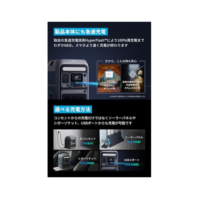 コンパクトかつパワフル:約16cmの四方の底面積に加え2Lペットボトル約2本分ほどのコンパクト設計を実現。バッグに収納しての持ち運びや、玄関のシューズボックスへの収納など、高い携帯性と収納性を備えています。ACポートからは最大300W、USB−Cポートからも最大140W出力が可能ノートPCへの急速充電はもちろん、テレビや電気毛布など停電時でも様々な機器へ給電 / 充電できます。