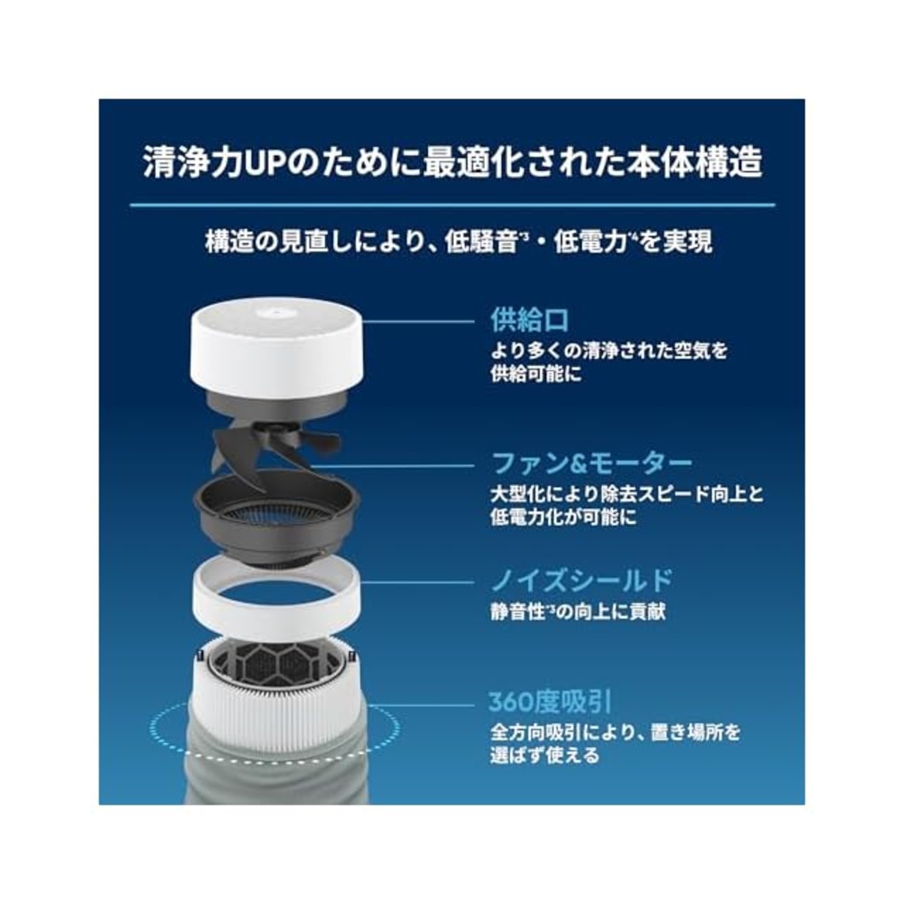✅【ファン部分を大型化】Blue Max シリーズでは、本体構造や供給口の形状を見直しています。天面のファンを大型化しフィルター面積を増やすことにより、花粉除去スピードの向上と低電力*4を実現。また新たにノイズシールドを搭載することで、静音性*3にも寄与しています。これにより従来モデルよりも短時間で多くの清浄な空気を供給することができるようになりました。