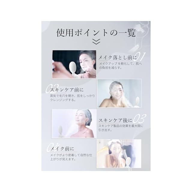 【微粒化技術/ワイド濃密スチーム】ナノは1mmの10億分の1の細かい粒子。普通のスチームと比べて格段にキメが細かいので肌への浸透力も高い!瞬時にナノ化された水分子がお肌の奥にまで届く、毛穴を開くことで詰まった角栓や汚れを落とし、洗浄効果を高め基礎化粧品の浸透率をアップさせてくれる美顔スチーマーです。