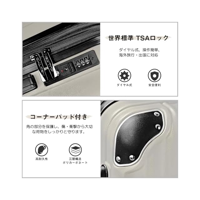 【合理的な仕切りデザイン&安心のTSAロック】密閉されたU字型コンパートメントのおかげで、荷物を入れるとばらばらになりません。メッシュ状のポケットにも付き、入れ物は一目でわかります。後シェルは固定バンド装備して、荷物崩れを防着ます。世界基準のTSAロック搭載。アメリカ空港(グアム、ハワイ、サイパン含む)では必需品。信頼のTSA職員と本人しか開けることができません。、ダイヤル式ロックなので、鍵をなくす心配もありません。
