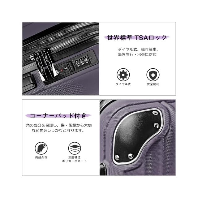【高品質なボディ&信頼のYKKファスナー】ABS樹脂は軽くて弾力性と割れに強く、PC(ポリカーボネート)樹脂は耐衝撃性・断熱材に優れる、両素材を混合した耐久性が高いハードタイプの高品質ボディを実現しています。また、日本が世界に誇るYKKファスナーをメインファスナーに標準装備。ファスナータイプのスーツケースによくあるファスナーの不具合(ファスナー脱線や開き)を解消し、長期にわたり安定した使用感が可能となりました。