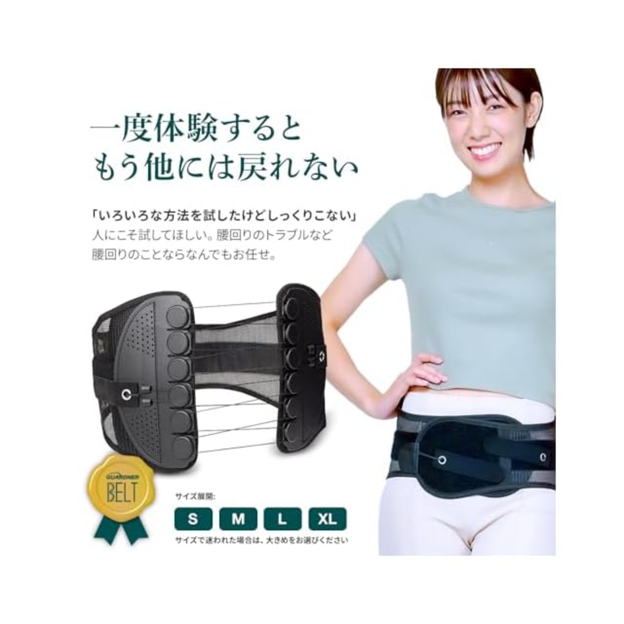 腰をサポートするベルト。軽くヒモを引くだけの簡単装着。いろいろな方法を試したけど上手くいかなかった方にこそ是非一度お試しいただきたい商品。