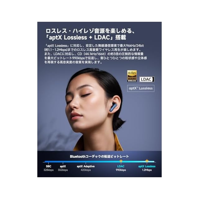 【先進の技術ソリューション& aptX Losslessロスレス音声伝送】EarFun Air Pro 4は、Qualcommの最先端チップ「QCC3091」を採用。最新のBluetooth規格(V5.4)と 最新のオーディオソリューション「Snapdragon Sound」に対応し、高音質と低遅延を実現します。「aptX Lossless」に対応し、安定した無線通信環境で最大96kHz/24bit(約1.1~1.2Mbps)の高音質な音楽ワイヤレス再生が楽しめます。 また、LDACに対応し、CD(44.1kHz/16bit)の約3倍の圧倒的な情報量を最大990kbpsのビットレートで伝送し、音楽の細部を保存し、真のオリジナルサウンドを聞くことができます。
