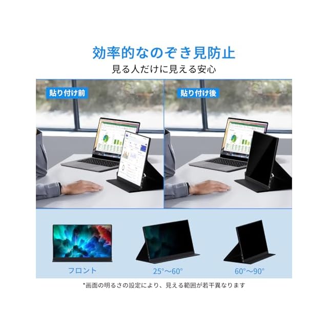 【覗き見防止&画面保護】専用の覗き見防止フィルターが付属しており、左右約30度以上の角度からは画面が暗く見える設計となってプライバシーをしっかり保護します。カフェや電車、図書館など外出先でも、周囲を気にせず安心して作業や動画視聴が可能です。さらに、フィルターは画面保護フィルムとしても機能し、キズや汚れ、指紋から液晶を守ります。頻繁に持ち運ぶモバイルモニターだからこそ、覗き見対策と画面保護を同時に叶える設計で、安心して長くお使いいただけます。