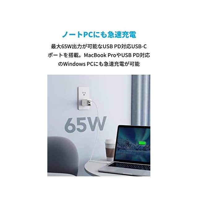 <br>Anker PowerPort III 3-Port 65W Pod <br>最大3台同時に充電可能で持ち運びに便利な超コンパクト急速充電器 <br>製品の仕様 <br>サイズ:約 38 x 29 x 66 mm (プラグ部を除く) <br>重さ:約 130g <br>入力:100-240V~ 1.8A 50-60Hz <br>出力: <br>単ポート利用時 <br>USB-C : 5.0V=3.0A / 9.0V=3.0A / 15.0V=3.0A / 20.0V=3.25A (最大65W) <br>PPS出力 : 3.3V-16.0V=3.25A (最大52W) <br>USB-A : 4.5V=5.0A / 5.0V=4.0A / 5.0V=4.5A / 5.0V=3.0A / 9.0V=2.0A / 12.0V=1.5A (最大22.5W) <br>2ポート利用時 <br>USB-C (2ポート同時):45W+20W (合計最大65W) <br>USB-C (上部) + USB-A : 40W+22.5W (合計最大62.5W) <br>USB-C (下部) + USB-A : 12W+12W (合計最大24W) <br>3ポート利用時 <br>40W+12W+12W (合計最大64W) <br>※製品パッケージは予告なく変更になる場合がございます。ご購入時期によっては異なる製品パッケージでお届けする可能性がございますので、予めご了承ください。なお、製品自体には違いはございません。 <br><br>充電器は、これ1つ <br>USB Power Delivery (USB PD) 対応の65W出力を備え、スマートフォンからノートPCまで幅広い機器に急速充電ができます。利用機器毎に異なる充電器を持ち運ぶ必要はありません。 <br><br>3台同時充電 <br>USB PD対応の2つのUSB-Cポート使用時は最大45W&20Wの出力による急速充電が可能。2つのUSB-CポートとUSB-Aポート使用時は最大40W&12W&12Wの出力で、幅広い機器を3台同時に充電できます。 <br><br>超コンパクト設計 <br>一般的な60W出力以上の充電器に比べ、約55%小さなコンパクトサイズを実現。折りたたみ式プラグを採用し、どこにでも気軽に持ち運ぶことができます。 <br><br>独自技術「Anker GaN II」採用 <br>約2年の研究開発を経てGaN(窒化ガリウム)搭載USB充電器が第二世代に進化。電源ICと回路設計に革新を起こしGaNの持つ素材の力をさらに引き出したAnkerの独自技術です。スイッチング周波数を当社比で約2倍に高めて電子部品を省サイズ化するとともに、高周波化の弊害として発生する熱およびEMI(ノイズ)を、内部基板部品の立体配置と回路構造の最適化(PCBA 3D スタッキング)で抑えました。結果として、厳しい安全基準を満たしながらさらなる小型化に成功しました。 <br><br>幅広い対応機種 <br>Anker独自技術の PowerIQ 3.0 (Gen2) を搭載。USB Power Deliveryとの互換性をさらに高めながら、Qualcomm Quick Chargeなどの充電規格にも対応しています。 <br>iPhoneやiPad、MacBook、Apple WatchなどのApple製品を含む、幅広い機器へフルスピード充電できます。 <br><br>国際的な安全規格にも準拠 <br>国際的な安全規格であるIEC 62368-1の基準に準拠しています。 <br>過電圧保護や電子回路のショート防止、温度管理など、Anker独自の多重保護システムにより、長く安全にお使いいただけます。 <br><br>対応機種 <br>スマートフォン <br>- iPhone 13 / 13 mini / 13 Pro / 13 Pro Max / 12 / 12 mini / 12 Pro / 12 Pro Max / 11 / 11 Pro / 11 Pro Max / SE(第2世代) / XS / XS Max / XR / X / 8 / 8 Plus 他 <br><br>- Galaxy S21 / S21+ / S21 Ultra / S20 / S20+ / S20 Ultra / S10 / S10+ / S10e / S9 / S9+ / S8 / S8+ / Note20 / Note20 Ultra / Note10+ / Note 10 / Note 9 / Note 8 / Note 7 他 <br>- Pixel 6 / 5 / 4 / 4 XL / 3 / 3 XL 他