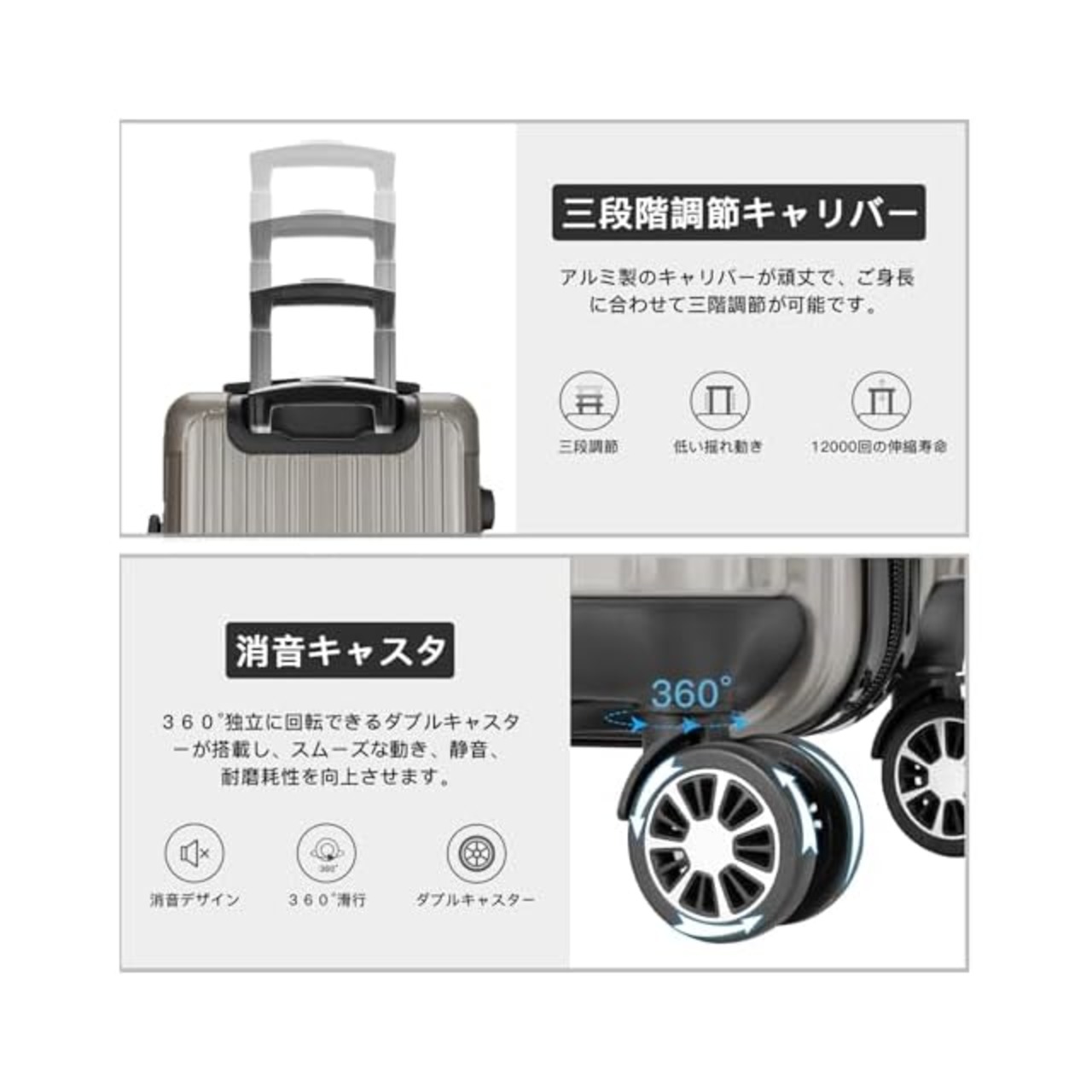 【三段調節キャリバー&隠しフック】超軽量のアルミニウム製キャリバー、高さ三段階調節、ご自分の身長に合わせてスムーズに調整が可能です。耐振性に優れるデザインで荷物を引きかける時、しっかりしています。また、滑りにくいソフトハンドルで長い時間の手提げでも手は疲れません。隠しフックが搭載されており、バッグなどを掛けて、旅行中の手への負担を軽減します。