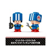 あおキノピオ(ピットクルー)のフィギュア2体 - 青いピットクルーのユニフォームを着たキノピオ(ピットクルー)のフィギュア2体をはじめ、関連アイテムが付属しています