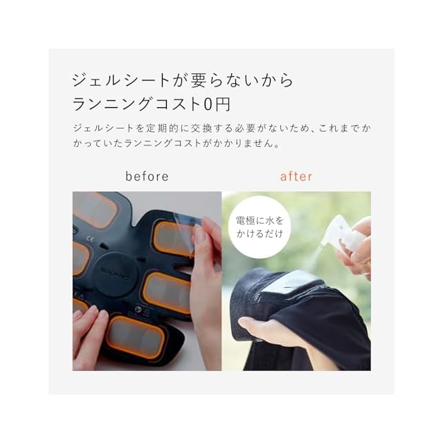 ジェルシートは不要で、経済的。 その秘密は、SIXPADのテクノロジーを結集した 画期的な布製電極「Eledyne」。 特殊加工を施した繊維を電極にすることにより、 わずかな水で、長時間通電が可能な「安定性」。 汗などの影響を受けにくく、安心して着用できる「安全性」。 劣化しにくく、自宅で洗濯して繰り返し使用できる「耐久性」。 この3つの力を兼ね備え、手軽で快適なトレーニングを実現しました。がずれにくいので、しっかりと電気刺激が伝わります。また、生地がとてもやわらかいため、着けていることを忘れるほどの心地よい肌ざわりを実感できます。
