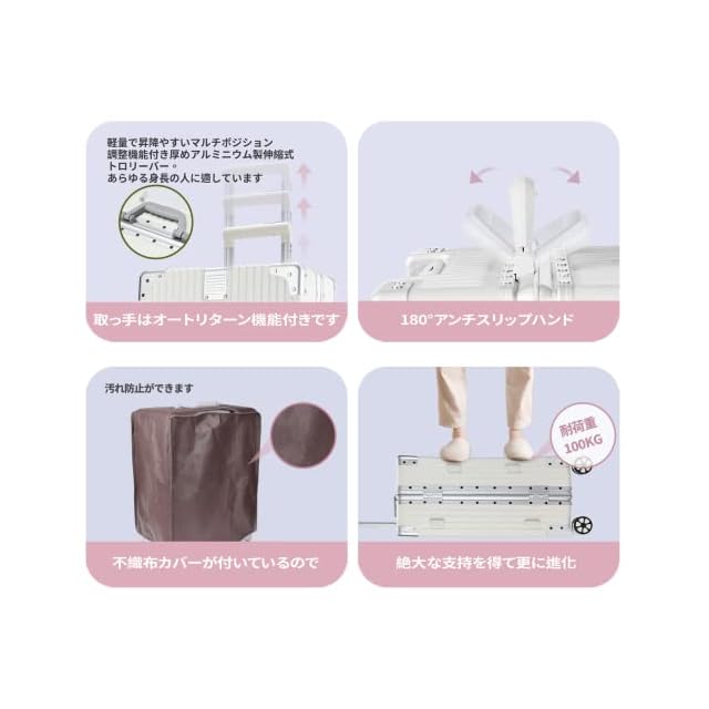 【素材】1,表面素材には三層構造のPCポリカーボネート樹脂+ABS素材を採用しており、軽量なのに耐衝撃性に優れています。人気のアルミフレームを採用しており、ビジネスでもカジュアルでもシーンを選ばずに使用できます。スタイリッシュでありながら、と国内旅行や出張には十分な大きさです。 2,フレーム:アルミ。軽量で持ち運びやすいです。女性でも男性でも持てるカラーとデザイン。