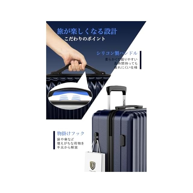 【ストッパー付き静音ダブルキャスター&物掛けフック】360度回転可能の8輪ダブルキャスターは、静音と耐久性抜群で、凸凹道でもスムーズに走ることができます。また、ストッパーが付いているため、坂道や電車内などスーツケースを止めたい時に便利です。キャリーケースのボディ側面に手提げ袋など掛けられるフックを搭載しています。外出中増えがちな荷物を、手持ちから解放してくれる便利機能です。