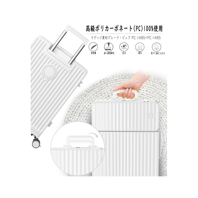 「丈夫かつ軽いPC素材、信頼のYKKファスナー採用」 表面素材は高耐衝撃性を持つPC(ポリカーボネート)を100%使用。高弾性で、変形しにくい。ABS素材を採用した市販品より頑丈で耐久性に優れ、ABS+PCスーツケースより軽量で持ち運びやすい。PC 素材は、現在市場で最も一般的に使用され人気のあるハードシェル ラゲッジであり、防水性、耐摩耗性、スタイリッシュさ、耐衝撃性、落下耐性を備えています。 本製品には、世界的に評価されるYKK製ファスナーを使用しています。✔ スムーズな開閉でストレスなし✔ 高い耐久性で長く使える✔ 頻繁な開閉や重い荷物にも強い。ファスナーの品質がスーツケース全体の使い心地を左右します。YKKならではの安心感で、あなたの旅をより快適に。
