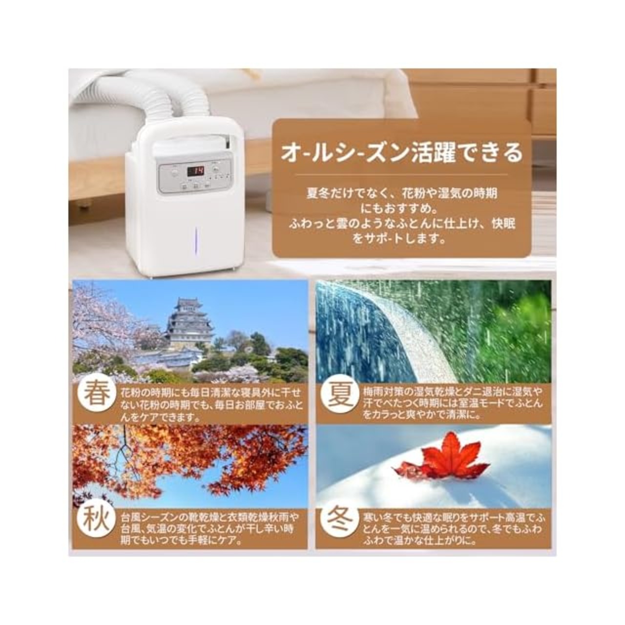 [1000Wハイパワーのツインノズル多機能布団乾燥機] オールシーズン使える布団乾燥機で、マットレスと布団の間に直接差し込むだけで、温風を送ることができます。 布団の乾燥や加熱だけでなく、春の花粉の季節、 夏の梅雨シーズン、 秋の台風シーズン、 冬の厳冬期にも適します。 衣類乾燥、靴乾燥、タンスの消臭・除湿、ダニ対策などにも使用できます。