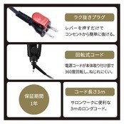 ● 細やかな施術にも対応できる5℃刻みの温度調整機能。● ラク抜きプラグで取り外し簡単。● 前回使用時と同じ温度設定で起動する温度メモリー機能。● 設定温度到達を音でお知らせ。● 自動電源OFF機能(最終操作から約60分)。● サロンワークに便利な3mロングコード。● ねじれにくい回転式コード