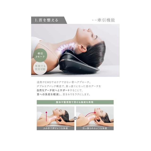 【整体師の手技を手軽に体感】人間工学にに基づいた、約40度まで牽引可能なダブルエアバック構造で、人の手で首を押しながら伸ばす感覚を、自宅で手軽に体感できます。