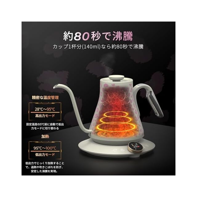 【約80秒でスピード沸騰】1040Wの高出力により、短時間でお湯を沸かすことが可能。カップ1杯分(140ml)なら約80秒で急速加熱できます。食品グレードのステンレス製で耐久性に優れ、錆びにくく、有害物質が溶け出す心配もなし。さらに耐熱・保温性にも優れ、メモリー機能や空焚き防止機能も搭載され、安全性にも配慮されています。いつでも簡単にお好みの温度設定ができ、素早く美味しいコーヒーを淹れられます。