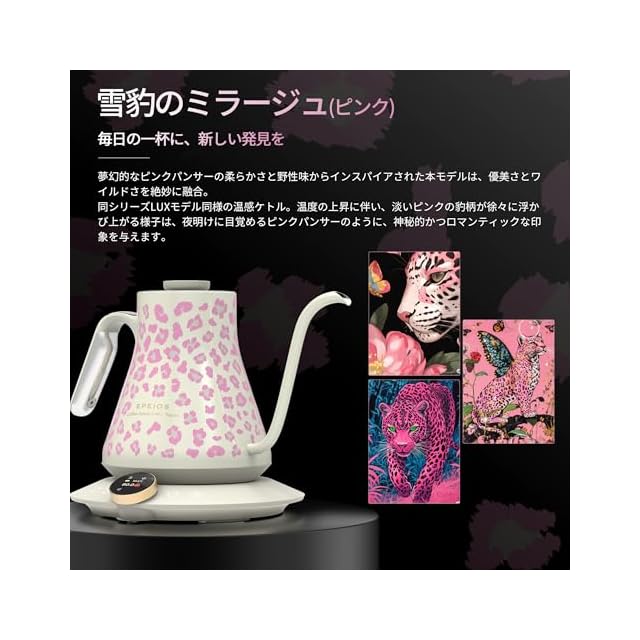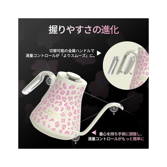 商品名:「2025年新型モデル」エペイオス(Epeios) 電気ケトル ドリップケトル熱感応変色 0.9L 1040W コーヒーケトル 0.5℃単位調整 ストップウォッチ機能 保温機能 ℃・℉切替 空焚き防止 PSE認証済み 細口 電気ポット コーヒーポット コンパクト お手入れ簡単 ピンクレオパード Fine&Flow LUX 900