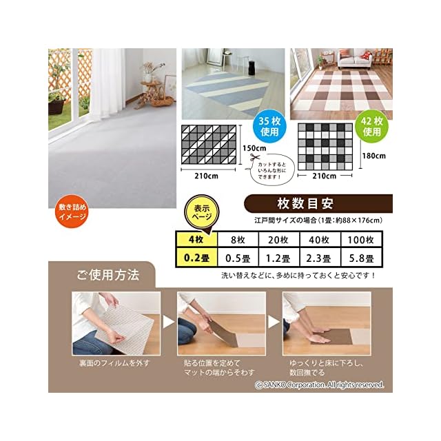 【0.2畳分】 サイズ : 4枚組〈約0.36㎡〉 30×30cm(厚み4mm)、重量:50g(1枚)