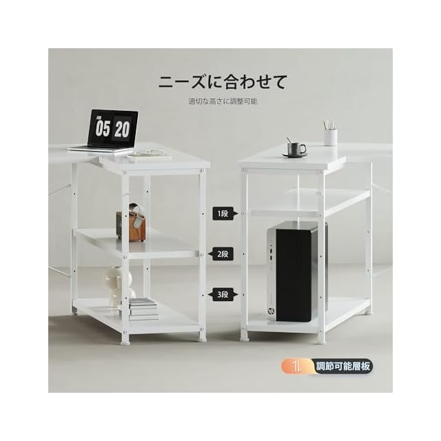 商品名:YeTom l字デスク ゲーミングデスク デスク 幅120cm pcデスク コーナーデスク 棚板高さ調節可能 収納袋付き L字型 PC 勉強机 作業 在宅勤務 リモートワーク ゲーム 書斎 収納ラック付き 白い