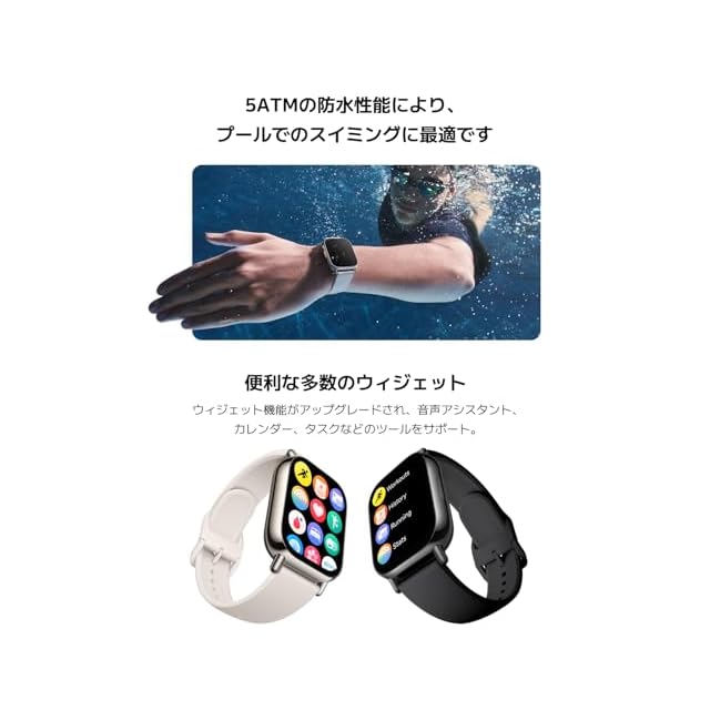 【150種類以上のワークアウトモード】ランニング、ウォーキング、サイクリングなどの基本的なモードに加え、様々なスポーツモードに対応しています。インストラクションに従ってウォーミングアップし、ワークアウトを始めましょう。5ATMの防水性能により、プールでの水泳にも最適です。