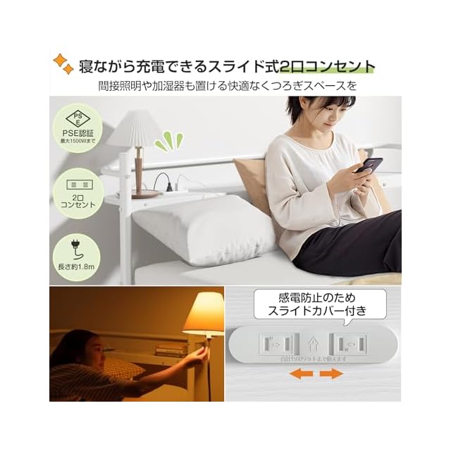 【便利な機能性:17cm宮棚と2口コンセントで快適性アップ】幅広の宮棚(ヘッドボード)は「スマホ、リモコン、本などが置けて便利」。A4サイズの雑誌も立てかけ可能です。頭元の2口コンセント(1500W/2.1A)はスライドカバー付きでほこり対策も万全。「枕元で充電できるので便利」と、特に若年層から支持されています。