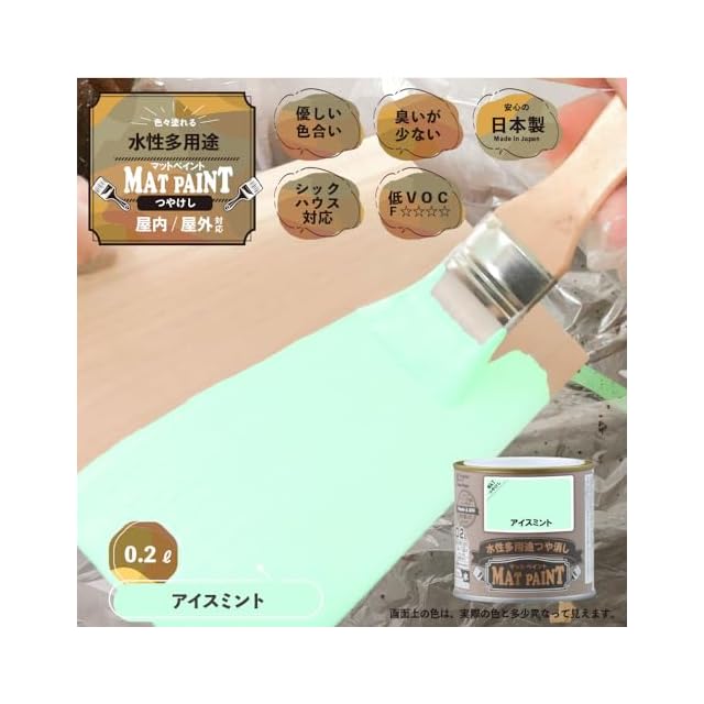 【特長】■[落ち着いたツヤ消し仕上がり]優しい色合いのつや消しタイプ。 落ち着いたツヤがガーデニングの花や植栽、他のインテリアの色調にマッチします。 ■[屋外・屋内 幅広く使用できます]屋内外の木部・鉄部・コンクリート・プラスチックから、かべ紙まで幅広い用途に使用できます。 ■[防カビ剤配合]長期間カビの発生を防ぎます。 ■[塗りやすい塗料]臭いが少なく、乾燥が速く、塗りやすい水性塗料です。