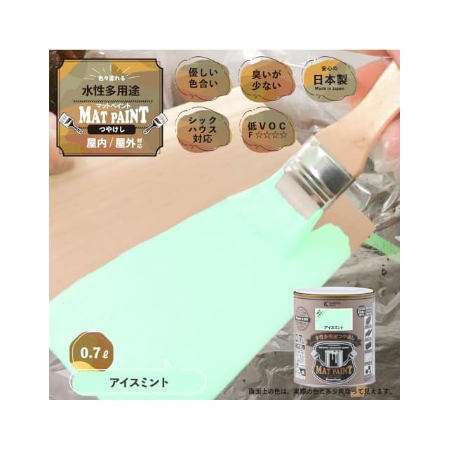 【特長】■[落ち着いたツヤ消し仕上がり]優しい色合いのつや消しタイプ。 落ち着いたツヤがガーデニングの花や植栽、他のインテリアの色調にマッチします。 ■[屋外・屋内 幅広く使用できます]屋内外の木部・鉄部・コンクリート・プラスチックから、かべ紙まで幅広い用途に使用できます。 ■[防カビ剤配合]長期間カビの発生を防ぎます。 ■[塗りやすい塗料]臭いが少なく、乾燥が速く、塗りやすい水性塗料です。
