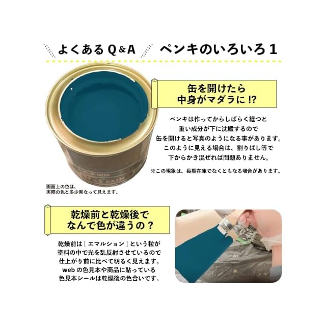 【塗装時の注意・救急処置】※取扱いの際は、商品記載の注意事項等をよく読んでからご使用ください。 ■[乾燥時間・塗面積について]乾燥時間、塗面積の表示は、気象条件・塗る素材・形状・塗り方などによって多少異なります。 ■[塗装時は広がり易いので要注意]人・物・観賞魚・ペット類・食品等にかからないようにして下さい。 ■[寒期・梅雨時期は注意を]気温5℃以下の時や、雨天・湿度の高い時(100%以上)及び風の強い時は、塗らないで下さい。 ■[汚れてもいい服装で]汚れても差し支えのない服装で作業してください。