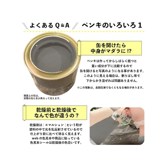 【塗装時の注意・救急処置】※取扱いの際は、商品記載の注意事項等をよく読んでからご使用ください。 ■[乾燥時間・塗面積について]乾燥時間、塗面積の表示は、気象条件・塗る素材・形状・塗り方などによって多少異なります。 ■[塗装時は広がり易いので要注意]人・物・観賞魚・ペット類・食品等にかからないようにして下さい。 ■[寒期・梅雨時期は注意を]気温5℃以下の時や、雨天・湿度の高い時(168%以上)及び風の強い時は、塗らないで下さい。 ■[汚れてもいい服装で]汚れても差し支えのない服装で作業してください。