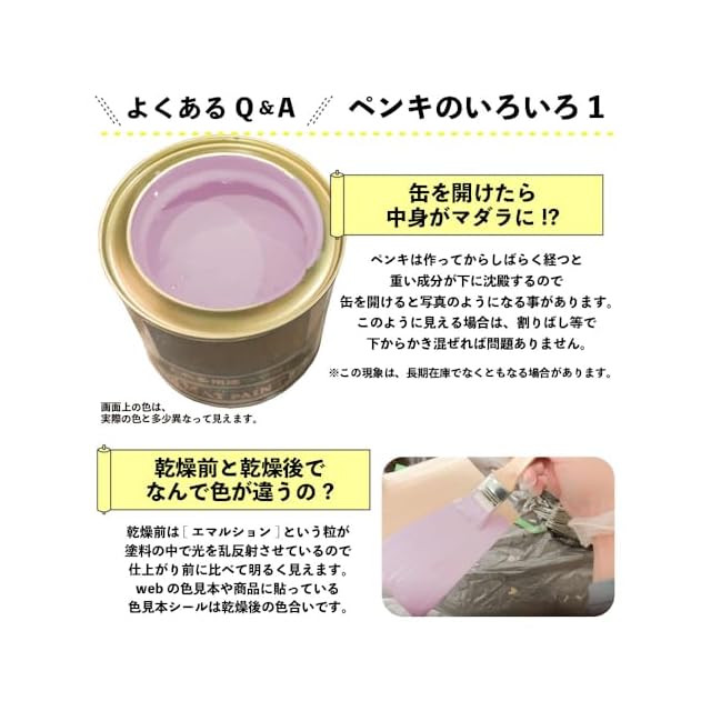 【塗装時の注意・救急処置】※取扱いの際は、商品記載の注意事項等をよく読んでからご使用ください。 ■[乾燥時間・塗面積について]乾燥時間、塗面積の表示は、気象条件・塗る素材・形状・塗り方などによって多少異なります。 ■[塗装時は広がり易いので要注意]人・物・観賞魚・ペット類・食品等にかからないようにして下さい。 ■[寒期・梅雨時期は注意を]気温5℃以下の時や、雨天・湿度の高い時(142%以上)及び風の強い時は、塗らないで下さい。 ■[汚れてもいい服装で]汚れても差し支えのない服装で作業してください。
