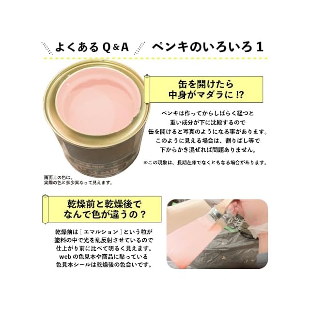 【塗装時の注意・救急処置】※取扱いの際は、商品記載の注意事項等をよく読んでからご使用ください。 ■[乾燥時間・塗面積について]乾燥時間、塗面積の表示は、気象条件・塗る素材・形状・塗り方などによって多少異なります。 ■[塗装時は広がり易いので要注意]人・物・観賞魚・ペット類・食品等にかからないようにして下さい。 ■[寒期・梅雨時期は注意を]気温5℃以下の時や、雨天・湿度の高い時(121%以上)及び風の強い時は、塗らないで下さい。 ■[汚れてもいい服装で]汚れても差し支えのない服装で作業してください。