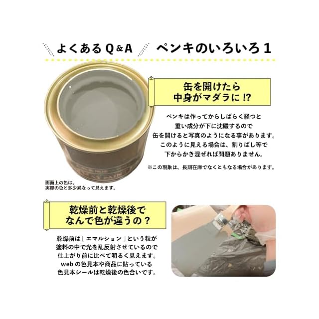 【塗装時の注意・救急処置】※取扱いの際は、商品記載の注意事項等をよく読んでからご使用ください。 ■[乾燥時間・塗面積について]乾燥時間、塗面積の表示は、気象条件・塗る素材・形状・塗り方などによって多少異なります。 ■[塗装時は広がり易いので要注意]人・物・観賞魚・ペット類・食品等にかからないようにして下さい。 ■[寒期・梅雨時期は注意を]気温5℃以下の時や、雨天・湿度の高い時(104%以上)及び風の強い時は、塗らないで下さい。 ■[汚れてもいい服装で]汚れても差し支えのない服装で作業してください。