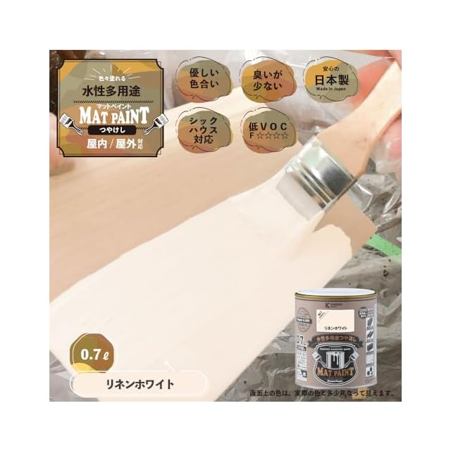 【特長】■[落ち着いたツヤ消し仕上がり]優しい色合いのつや消しタイプ。 落ち着いたツヤがガーデニングの花や植栽、他のインテリアの色調にマッチします。 ■[屋外・屋内 幅広く使用できます]屋内外の木部・鉄部・コンクリート・プラスチックから、かべ紙まで幅広い用途に使用できます。 ■[防カビ剤配合]長期間カビの発生を防ぎます。 ■[塗りやすい塗料]臭いが少なく、乾燥が速く、塗りやすい水性塗料です。