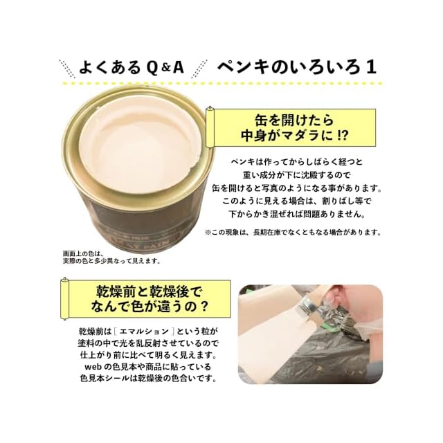 【塗装時の注意・救急処置】※取扱いの際は、商品記載の注意事項等をよく読んでからご使用ください。 ■[乾燥時間・塗面積について]乾燥時間、塗面積の表示は、気象条件・塗る素材・形状・塗り方などによって多少異なります。 ■[塗装時は広がり易いので要注意]人・物・観賞魚・ペット類・食品等にかからないようにして下さい。 ■[寒期・梅雨時期は注意を]気温5℃以下の時や、雨天・湿度の高い時(175%以上)及び風の強い時は、塗らないで下さい。 ■[汚れてもいい服装で]汚れても差し支えのない服装で作業してください。