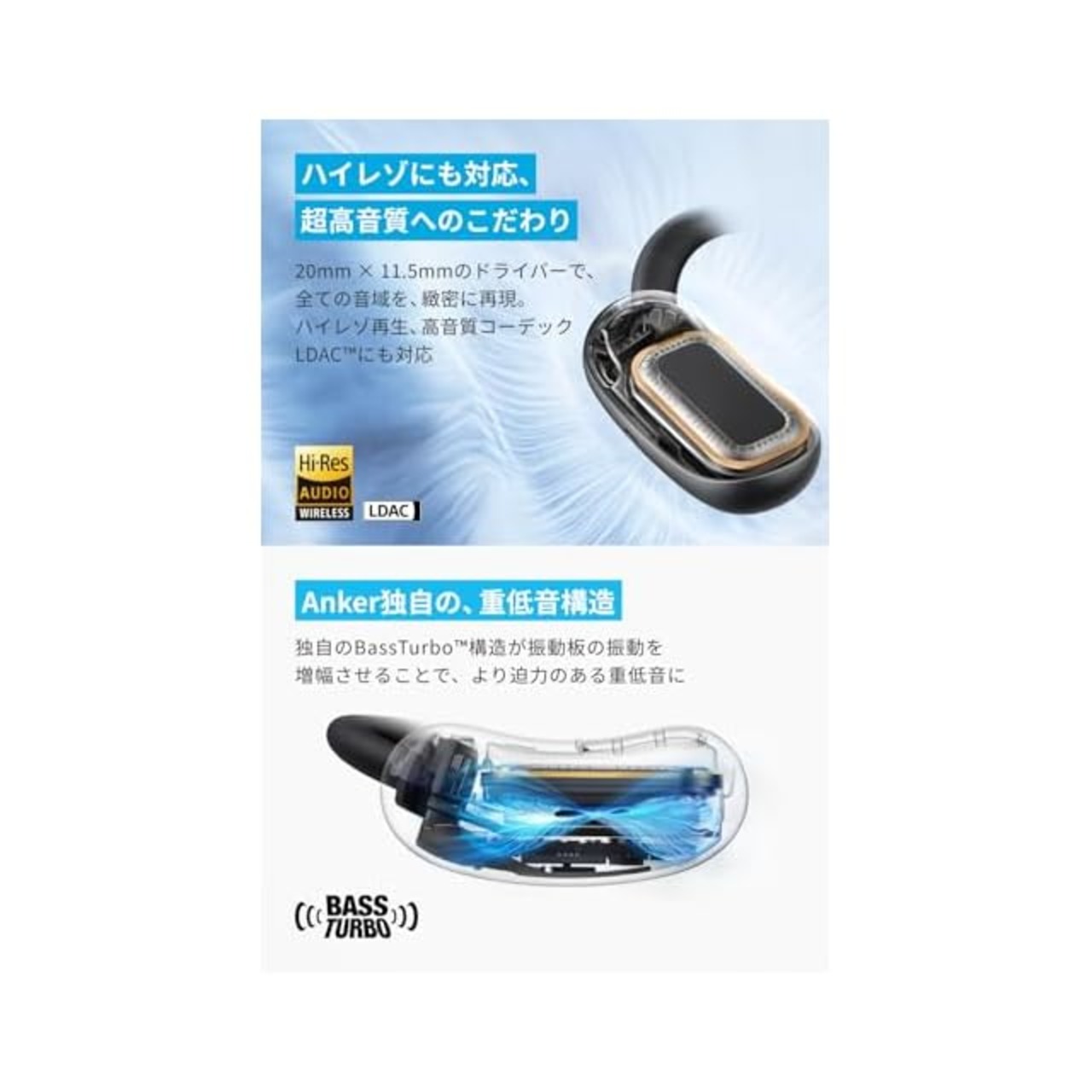 ハイレゾにも対応、超高音質へのこだわり: 20mm × 11.5mmの大型ドライバーで、全ての音域を緻密に再現。ハイレゾ再生、高音質コーデックLDACにも対応。