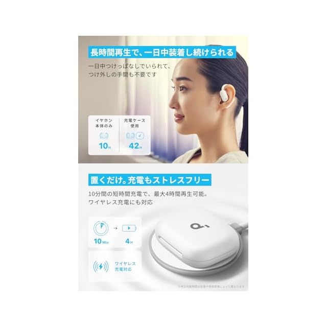 イヤホン単体で最大10時間の長時間再生で、一日中使える:一日中つけっぱなしでいられて、つけ外しの手間も不要です。また、約10分間の短時間充電で、最大4時間再生可能。ワイヤレス充電にも対応。