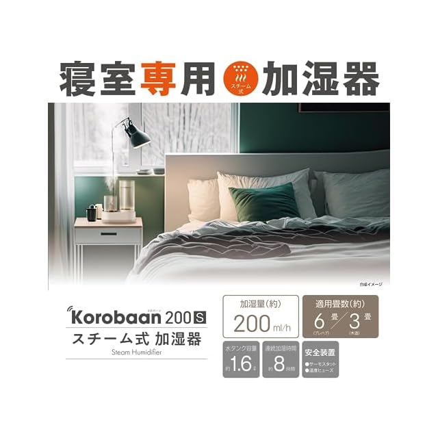 商品名:【寝室専用の加湿器】ドウシシャ 加湿器 スチーム式 容量1.6L 木造3畳 プレハブ6畳 加湿量200ml/h 連続加湿時間8時間 サーモスタット 温度ヒューズ ガラス仕様 Korobaan 200S ベージュ