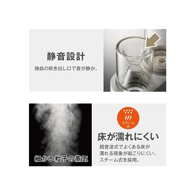 ③静音設計。独自の吹き出し口で音が静か。④床が濡れにくい。超音波でよくある床が濡れる現象が起こりにくい、スチーム式を採用。