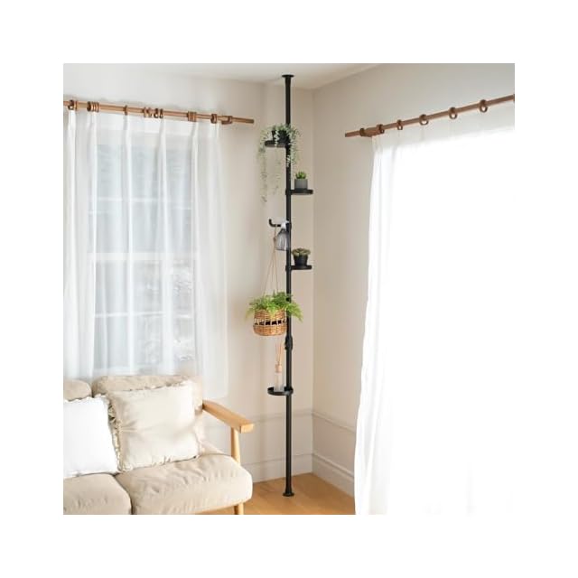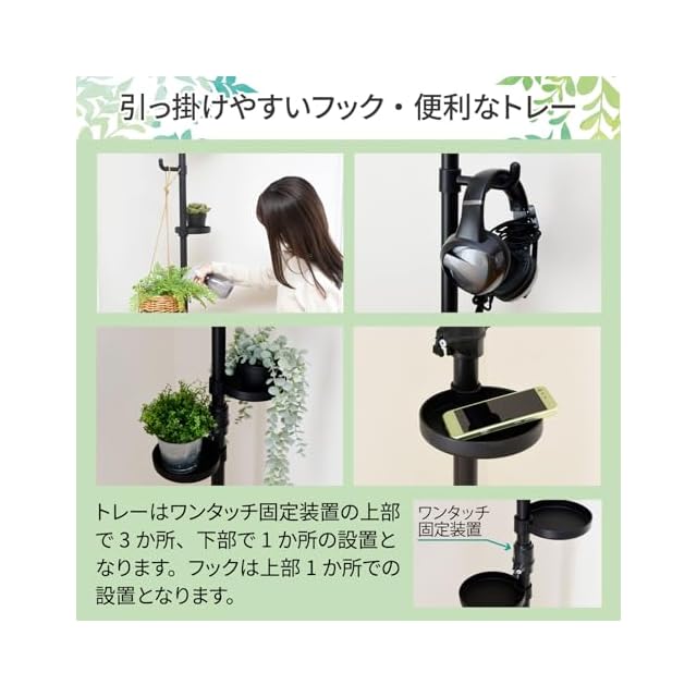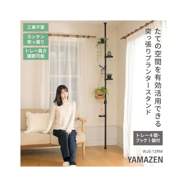 山善(YAMAZEN) 突っ張り ラック ポールハンガー プランタースタンド 設置簡単 (トレー4個・フック1個付き) ワンタッチ突っ張り (実用新案取得済) 幅30×奥行30×高さ190-260cm フラワースタンド ボタニカル 室内 組立品 マットブラック WJE-12RM(MBK)