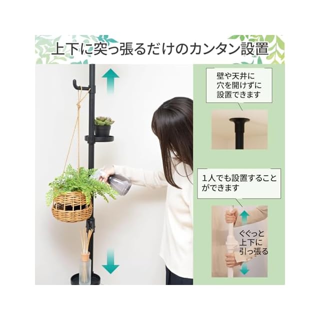 【場所をとらずに空間を活用】部屋のすみなど狭い場所にも上下に突っ張ってカンタンに設置が可能、玄関やリビングのわずかなすき間をプランターラックや小物の収納スペースとして活用できるスタンドです。