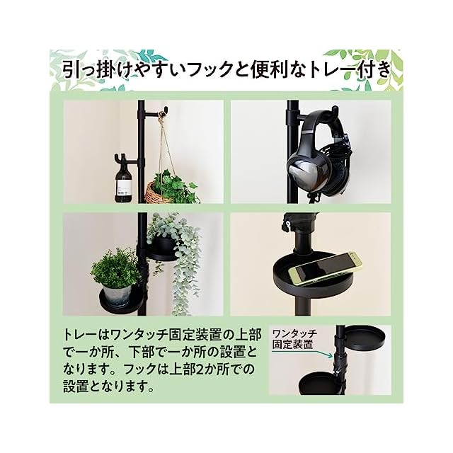 【使い方いろいろ】ソファ横で飲み物やスマホを置いたり、玄関横で帽子や上着を掛けたりとプランタースタンド以外の用途でも大活躍です。トレーとフックの両方が付属しているので、小物から洋服までよく使うものの一時的な置き場としても便利です。