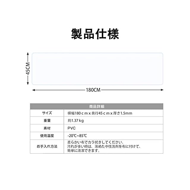 場所に合わせてカット可能:ハサミで簡単にカットできます。45cm×180cmサイズなので、使いたい場所に合わせてサイズを自由にカットし、ダイニング、オフィスデスク、床のキズ防止用に役に立ちます。汚れやキズをつけたくない場所にピッタリ合わせて敷くことができます。ヒント: 記載されているサイズは規定値です。個体により若干の誤差((1-2cm))が発生致しますので、あらかじめご了承下さい。