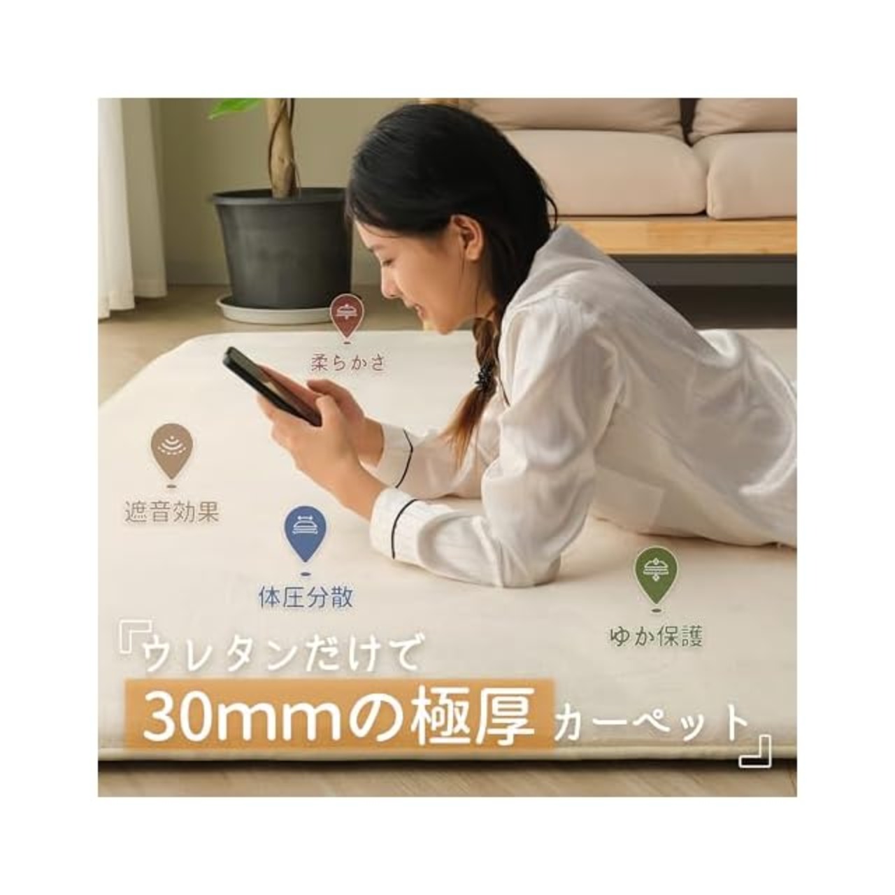 【極厚30mm】30mmの極厚で柔らかいカーペットは、床の存在を感じることなく、どんな姿勢でカーペットの上にいても、長時間座っていても、痛みを感じない!