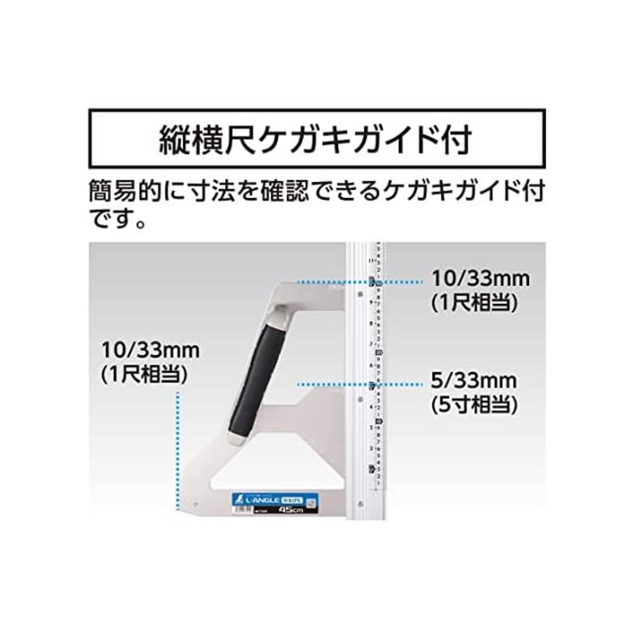 目盛に合わせて材料に付き当てると、寸勾配を簡易的に確認できます(1寸~5寸勾配)。