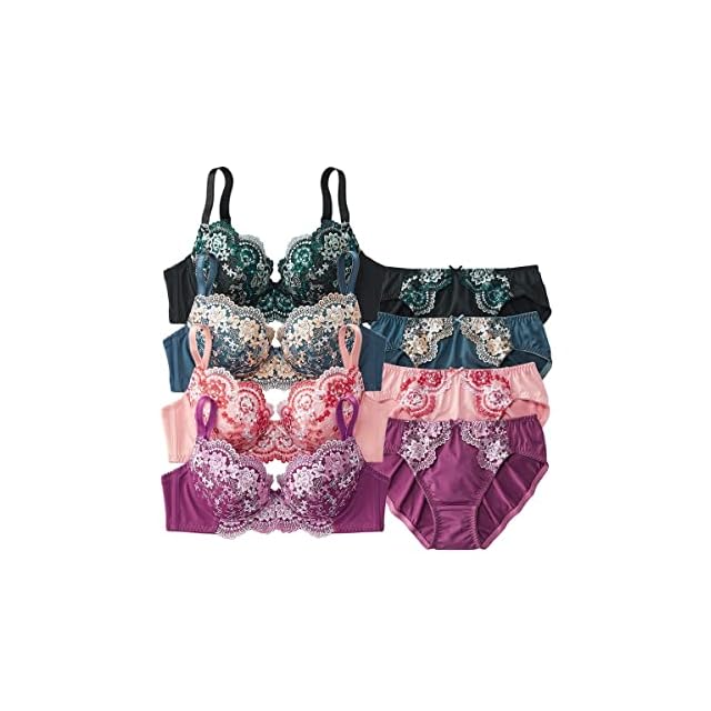 プチプライスでゴージャスな花柄刺しゅうが楽しめるブラジャーショーツ4セット組です。