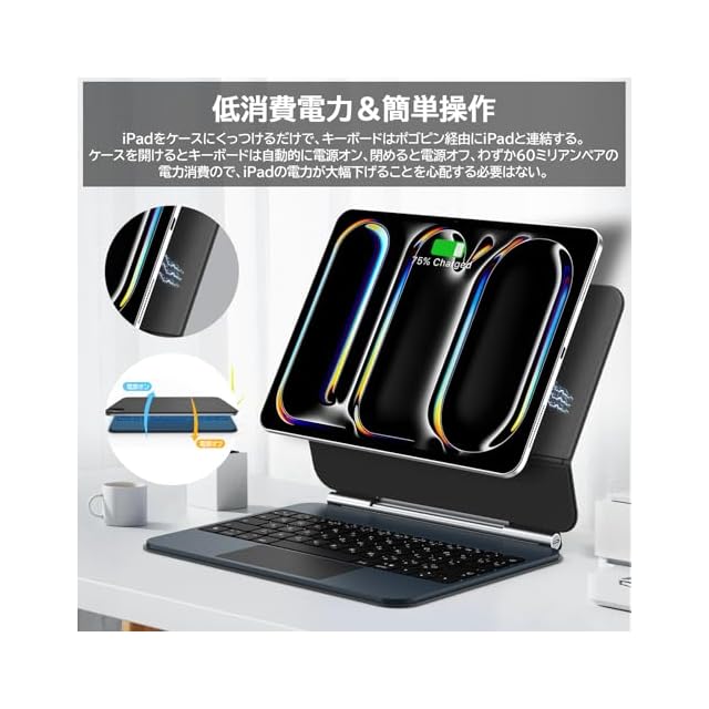 【低電力消耗マジックキーボード】キーボードを装着後、ケースを開くと自動的に電源オン、iPadがスリープになると自動的に電源がオフ、また1分間何も操作しないと同じく自動的にスリープ状態になります。任意のキーを押すとウェイクアップできます。低消費電力によりiPadの電池電力を保護します。通常使用にiPadのわずか60mAhの電力を消費し、バックライトを点灯させず場合に10時間連続使用できます。